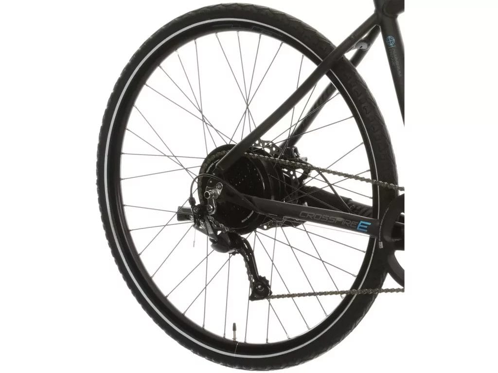 Motor-wise, the Carrera Crossfire electric bike comes with a Suntour Performance 36V hub rear electric motor which can produce up to 60Nm of torque with a cadence sensor to produce torque-sensing power levels from the hub motors design.